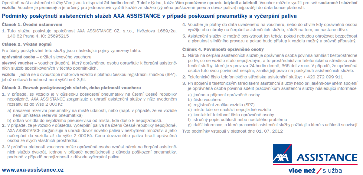 Ve spolupráci s AXA ASSISTANCE se mohou klienti portálu Pojisteni.com zapojit do soutěže o vouchery na asistenční služby při defektu pneumatiky a při došlém palivu. Podrobné podmínky asistenčních služeb naleznete v tomto dokumentu. Voucher lze uplatnit až do konce roku 2016.